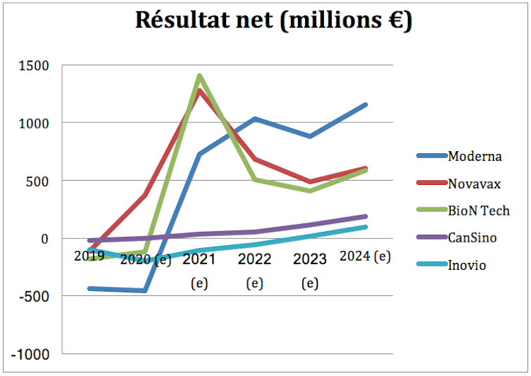Les montants de ces bénéfices prévisionnels restent par ailleurs impressionnants, avec par exemple pour Novavax en 2021 un résultat net prévu de 1,5 milliard de dollars pour un chiffre d’affaires de 2,7 milliards (à comparer pour 2019 à un résultat net négatif de 132,7 millions de dollars pour un chiffre d’affaires de 18,7 millions).