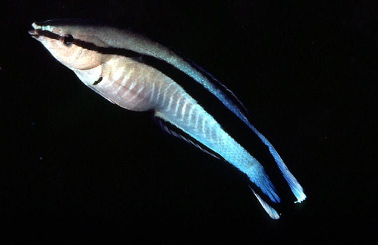 Ce minuscule poisson d’une dizaine de centimètres est un poisson des récifs tropicaux du pacifique. Il est connu pour former une relation mutuelle avec des plus gros poissons (hôtes) en se nourrissant des parasites vivants qu’il détecte visuellement sur leur peau.