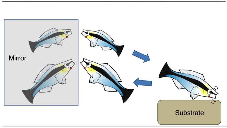 Même si ce comportement n’avait jamais été observé jusqu’alors, rien ne prouvait que ces labres eussent bien conscience d’eux-mêmes ! Les chercheurs ont alors injecté un gel coloré dans le cou de ces mêmes poissons, tache qu’ils ne peuvent pas voir en vision directe mais qu’ils peuvent distinguer dans le miroir.