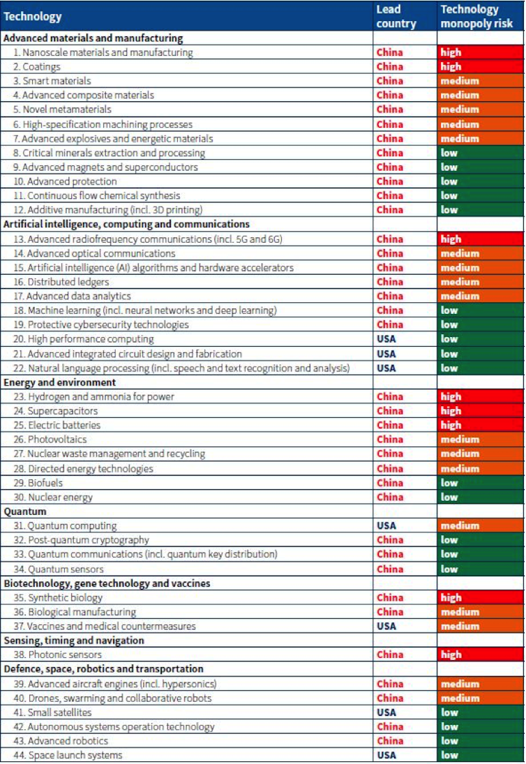 Aujourd’hui, d’après un rapport de l’Australian Sciences Policy Institute (ASPI), la Chine est en tête dans la compétition technologique mondiale et devance les États-Unis dans 37 des 44 technologies dites « critiques » identifiées par l’ASPI. Parmi celles-ci : les communications radiofréquences (5G, 6G), l’hydrogène, les batteries électriques, les nano-matériaux, les revêtements avancés, les super-condensateurs, l’hypersonique… Dans huit d’entre elles, le risque que la Chine devienne monopolistique est jugé élevé.