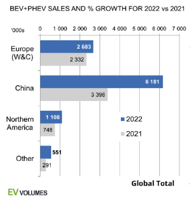 Cela s’est traduit, pour les entreprises occidentales, par un recul sur les marchés internationaux. L’éolien, le ferroviaire ou l’aéronautique en sont des exemples notables : après des transferts de technologies vers la Chine, les entreprises occidentales de ces secteurs ont été fortement concurrencées, voire dépassées par des entreprises chinoises. Sur les marchés émergents, la croissance chinoise est spectaculaire. L’exemple le plus commun concerne les véhicules électriques. Dans ce domaine, la Chine représentait 60 % du marché mondial en 2022 :