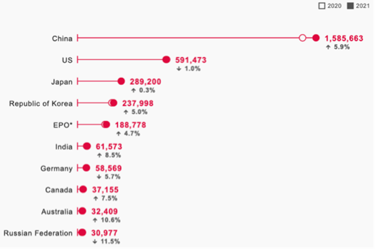 Plus généralement, en matière d’innovation et de technologies émergentes, l’analyse des dépôts de brevets donne une idée de l’activité. Selon le World Intellectual Property Office (WIPO ou OMPI en français, affilié aux Nations unies), la Chine devance de loin et depuis longtemps les autres pays pour les dépôts de brevets :