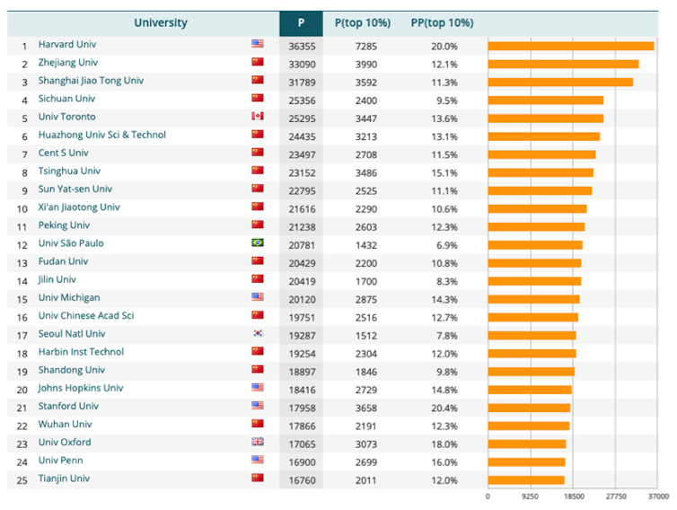 Au niveau des établissements d’enseignement supérieur et de recherche, les classements internationaux montrent aussi une percée de la Chine. On retrouve par exemple 16 établissements chinois sur les 25 premiers du classement de Leiden, qui classe les universités selon le nombre de publications scientifiques de leurs chercheurs, en fonction de critères à la fois quantitatifs (nombre total de publications scientifiques) et qualitatifs (uniquement les publications dans le Top 10 % des revues les plus cotées).